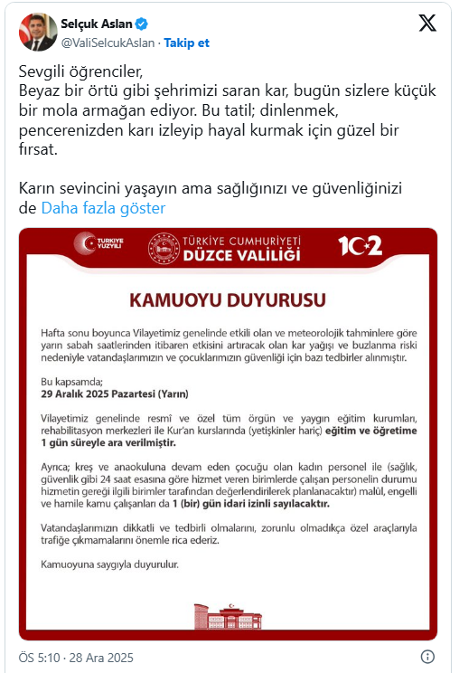 Konuya ilişkin Van Valiliğinden yapılan açıklamada, " Meteoroloji Bölge Müdürlüğümüzle yapılan değerlendirmeler neticesinde, Van'da etkisini sürdüren yoğun kar yağışı, buzlanma ve sis nedeniyle 29 Aralık 2025 Pazartesi günü (yarın) ilimiz geneli resmi/özel tüm örgün ve yaygın eğitim kurumlarında (RAM, Halk Eğitim Merkezleri, Aile Destek Merkezleri ve Rehabilitasyon Merkezleri dahil) eğitim-öğretime 1 gün süreyle ara verilmiştir. Kamu kurum ve kuruluşlarında çalışan engelli ve hamile personelimiz idari izinli sayılacaktır.0-6 yaş çocuğu olan kamu kurum ve kuruluşlarında çalışan anneler de idari izinli sayılacaktır" denildi.