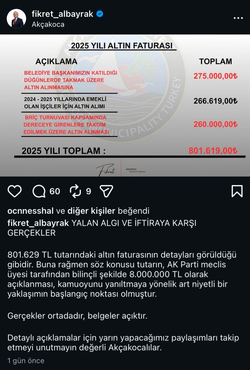 Mecliste yaşanan gelişmelerin ardından Akçakoca Belediye Başkanı Fikret Albayrak, sosyal medya hesabından “Yalan algı ve iftiraya karşı gerçekler” ifadeleriyle bir paylaşım yaptı.Paylaşımda, “2025 yılı altın faturası” başlığı altında belediye tarafından yapılan altın alımlarına ilişkin detaylı bir tablo yer aldı. Açıklamada, toplam harcamanın yaklaşık 801 bin TL olduğu belirtilirken, kamuoyunda dile getirilen daha yüksek rakamların gerçeği yansıtmadığı ifade edildi.Başkan Albayrak paylaşımında, söz konusu harcamaların düğünler, emekli işçiler ve çeşitli etkinlikler kapsamında gerçekleştirildiğini belirtti.
