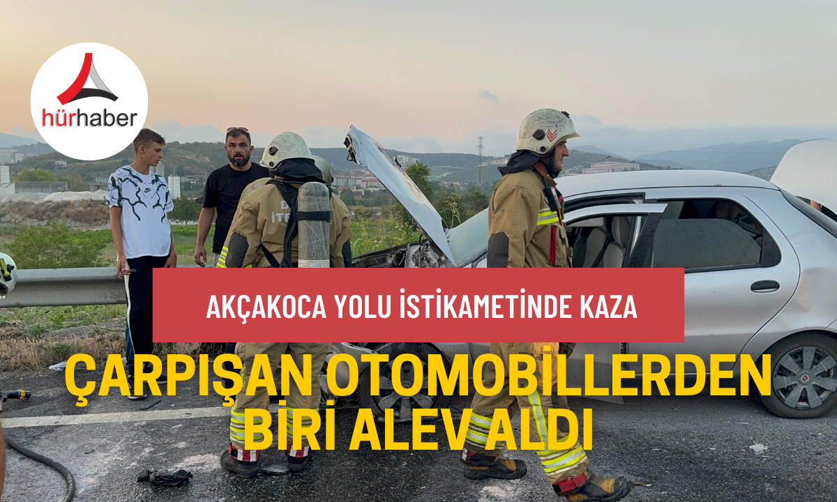 Akçakoca yolu istikametinde Çarpışan otomobillerden biri alev aldı