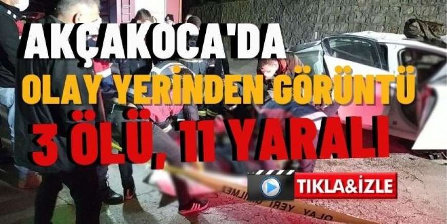 Düzce’nin Akçakoca ilçesinde yolcu otobüsü ile otomobilin çarpışması sonucu meydana gelen kazada otomobildeki 3 kişi hayatını kaybederken, otobüste bulunan biri ağır 11 kişi yaralandı.Edinilen bilgilere göre, Düzce’nin Akçakoca ilçesinden Sakarya’nın Kocaali ilçesine seyir halinde Fuat Karagöz idaresindeki 14 AAY 823 plakalı Peugeot marka otomobil, Akçakoca Yeldüzü mevkiinde karşı yönden gelen Ahmet Y. idaresindeki 34 ANB 135 plakalı Mercedes marka yolcu otobüsü ile kafa kafaya çarpıştı. Çarpışmanın etkisi ile otobüs bariyerlere çarparken, otomobil sulama kanalına çarparak durabildi. Kazayı gören çevredeki vatandaşların ihbarı üzerine olay yerine çok sayıda ambulans sevk edildi. Olay yerine gelen ambulans ekipleri otomobil içerisinde bulunan sürücü Fuat Karagöz ile araçta bulunan Fikret Yaman ve Semiha Mumcuoğlu’nun hayatını kaybettiğini belirledi. Trafik kazasında yaralanan biri ağır 11 kişi ise Düzce, Sakarya ve Zonguldak’ta ki hastanelere kaldırılarak tedavi altına alındı. Nöbetçi Cumhuriyet Savcısının olay yerinde inceleme yapmasının ardından cesetler Akçakoca Atatürk Devlet Hastanesi morguna kaldırıldı. Kaza nedeni ile uzun süre trafiğe kapalı olan yol, araçların kaldırılmasının ardından normal seyrine döndü. “Biz yolumuzda gidiyorduk, bize çarptı”Otobüs içerisinde bulunan yolcular kaza ile ilgili olarak, “Biz normal yolumuzda gidiyorduk. Araç sollamaya çıktı. Bir anda gelip bize çarptı. Otomobil çok hızlı geliyordu” dedi. Öte yandan otobüsün içinde 27 yolcu olduğu öğrenildi. Kazayla ilgili geniş çaplı soruşturma başlatıldı.