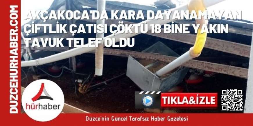 Düzce’nin Akçakoca ilçesinde bir tavuk çiftliğinin çatısı biriken kar sebebiyle çöktü. Çatının çökmesi sonucu yaklaşık 18 bin tavuk telef oldu.Kar yağışı Düzce’nin Akçakoca ilçesinde bir tavuk çiftliğinin çatısının çökmesine sebep oldu. Kocaali ilçesinde yaşayan Fatih Yılmaz’a ait olan ve Akçakoca'nın Nazımbey köyünde bulunan tavuk çiftliğinin çatısı biriken kar sebebiyle çöktü. Çatının çökmesiyle içeride bulunan yaklaşık 18 bin tavuk telef oldu.