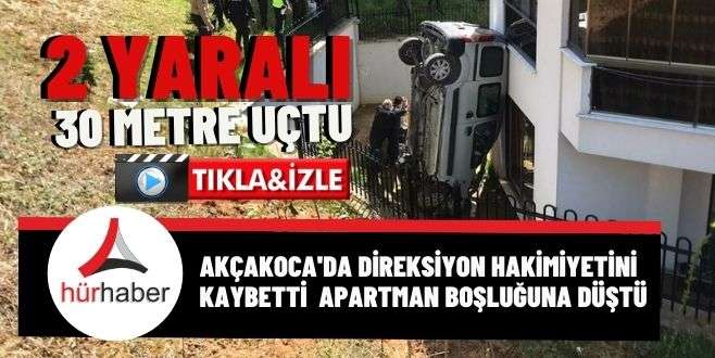 Düzce’nin Akçakoca ilçesinde meydana gelen trafik kazasında hafif araç sürücünün direksiyon hakimiyetini kaybetmesi sonucunda yoldan çıkarak 30 metre uçtu, apartman boşluğuna düştü. Kazada araç içinde bulunan 2 kişi yaralandı.Kaza Düzce’nin Akçakoca ilçesi Osmaniye Mahallesi TOKİ konutları mevki'inde meydana geldi. Alınan bilgilere göre S. U. (71) idaresindeki 34 RL 551 plakalı Renault Kangoo marka hafif ticari araç sürücünün direksiyon hakimiyetini kaybetmesi sonucunda yoldan çıkarak apartman boşluğuna düştü.