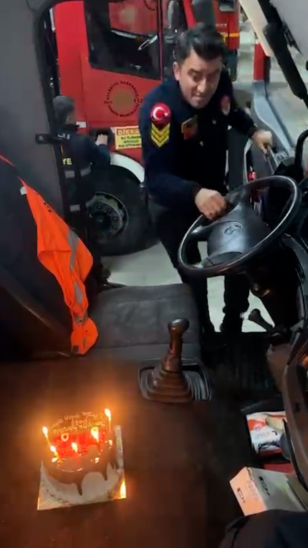 Duyduğu adres karşısında panikleyen ve "Anam anam benim ev" diyerek itfaiye aracına koşan Özer, sürücü koltuğuna geçmek için kapıyı açtığında sürprizle karşılaştı. Direksiyon başında yanan mumlarla süslenmiş doğum günü pastasını gören Özer, kısa süreli şaşkınlığın ardından rahat bir nefes aldı.Cep telefonu kamerasıyla kaydedilen görüntülerde, yaşadığı paniğin ardından kahkahaya boğulan Özer'in, mesai arkadaşlarının alkışları eşliğinde pastayı üfleyerek teşekkür ettiği görüldü.