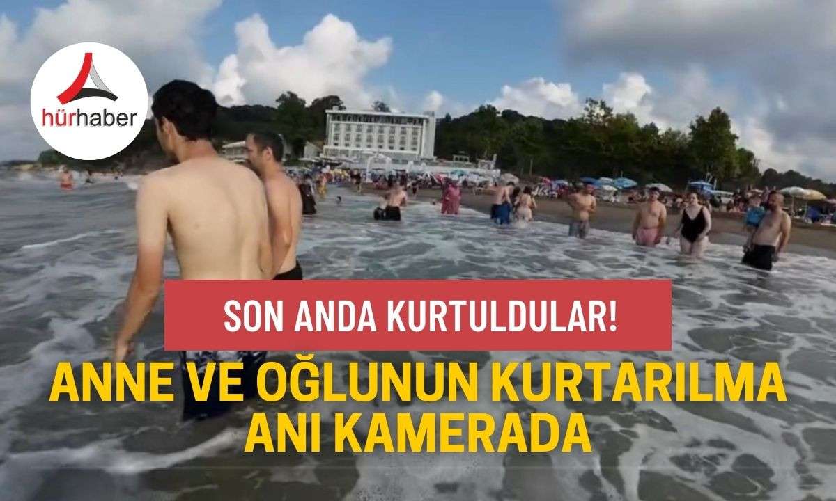 Düzce’nin Akçakoca ilçesinde dalgalı denizde dip akıntıya kapılarak boğulma tehlikesi geçiren anne ve oğlunun kurtarılma anı an be an kameralara yansıdı.