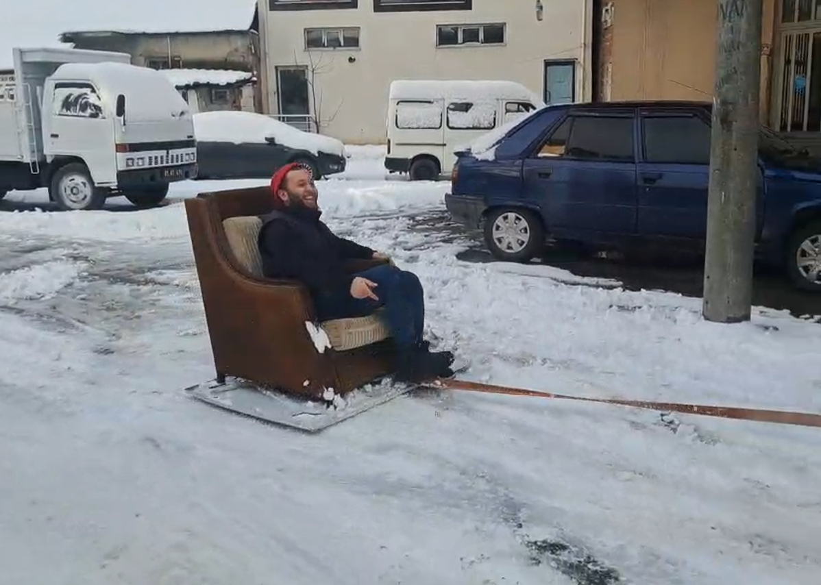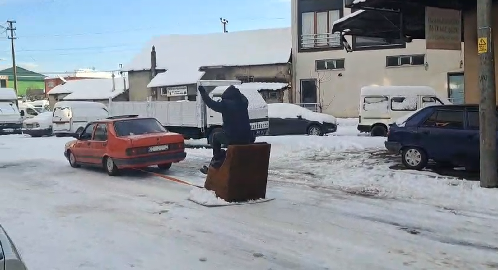 Büyükler, çocukların coşkusuna ortak olurken, bir grup vatandaş ise aracın arkasına bağladıkları koltukla kayarak kışın keyfini sürdü ve bu anları çektiği videolarla kayıt altına alındı.