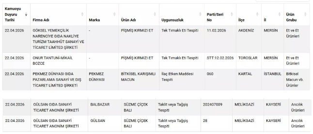 Yeni yayımlanan listede ise tek tırnaklı eti tespit edilen markalar ifşa edildi. Mersin'de bulunan "Göksel Yemekçilik" ve "Onur Tantuni" adlı işletmelerin vatandaşa "tek tırnaklı" (at ve eşek eti) yedirdiği belirlendi.Geçtiğimiz aylarda, Mersin’de aşhanede şampiyon yarış atı Smart Latch kesilerek vatandaşa yedirilmesi gündem olmuştu.