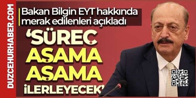Çalışma ve Sosyal Güvenlik Bakanı Vedat Bilgin, EYT ile ilgili, “Süreç aşama aşama ilerleyecek. Meclis kararını verecek. Ocak ayı içinde Meclis'e ileteceğiz. Üzerimize düşen görev sorumluluğunu tamamladık” dedi.