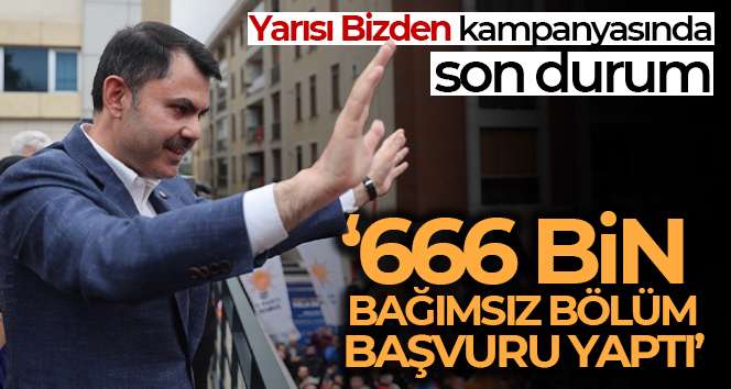 Çevre, Şehircilik ve İklim Değişikliği Bakanı ve İstanbul 1'inci Bölge Milletvekili Adayı Murat Kurum, “Bugün itibariyle ‘Yarısı Bizden’ kampanyamıza tam 666 bin bağımsız bölüm başvuru yaptı” dedi.