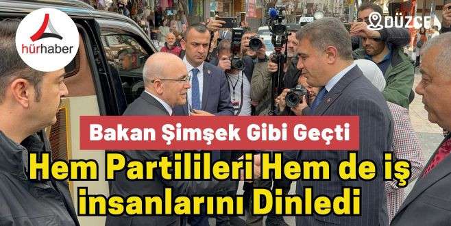 Hazine ve Maliye Bakanı Mehmet Şimşek, Düzce’de önce AK Partililerle sonrasında ise Düzce Ticaret ve Sanayi Odası’nda iş insanlarıyla bir araya geldi.Hazine ve Maliye Bakanı Mehmet Şimşek, Düzce’ye geldi. İlk olarak AK Parti İl Başkanlığını ziyaret eden Şimşek, partililerle bir araya geldi. Basına kapalı gerçekleştirilen ziyaretin ardından Bakan Şimşek, Düzce Ticaret ve Sanayi Odası’nı ziyaret etti. Düzceli iş adamlarıyla bir araya gelen Bakan Şimşek, ekonomi ile ilgili iş adamları ile sohbet etti. Basına kapalı gerçekleştirilen programın ardından Bakan Şimşek, Düzce’den ayrıldı.