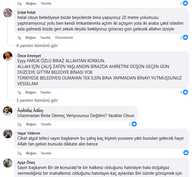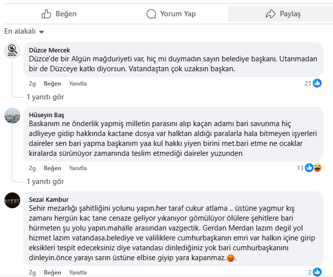Bir grup vatandaş bu duruma sessiz kalındığını iddia ederek Başkan Özlü’ye tepki gösterdi. "Düzce'ye katkıdan" bahseden paylaşımlar karşısında, bazı yerel sakinlerin Belediye Başkanı'nın vatandaşın sorunlarına yeterince duyarlı olmadığını vurgulayan yorumlar yapması dikkat çekti. Ayrıca, Cihat Algül'ün tefeci olarak adlandırılması ve bu kişinin pek çok insanın mağduriyetine sebep olduğu iddiaları da yorumlarda yer almakta, bu gibi konuların dikkate alınması gerektiği ifade edilmektedir.