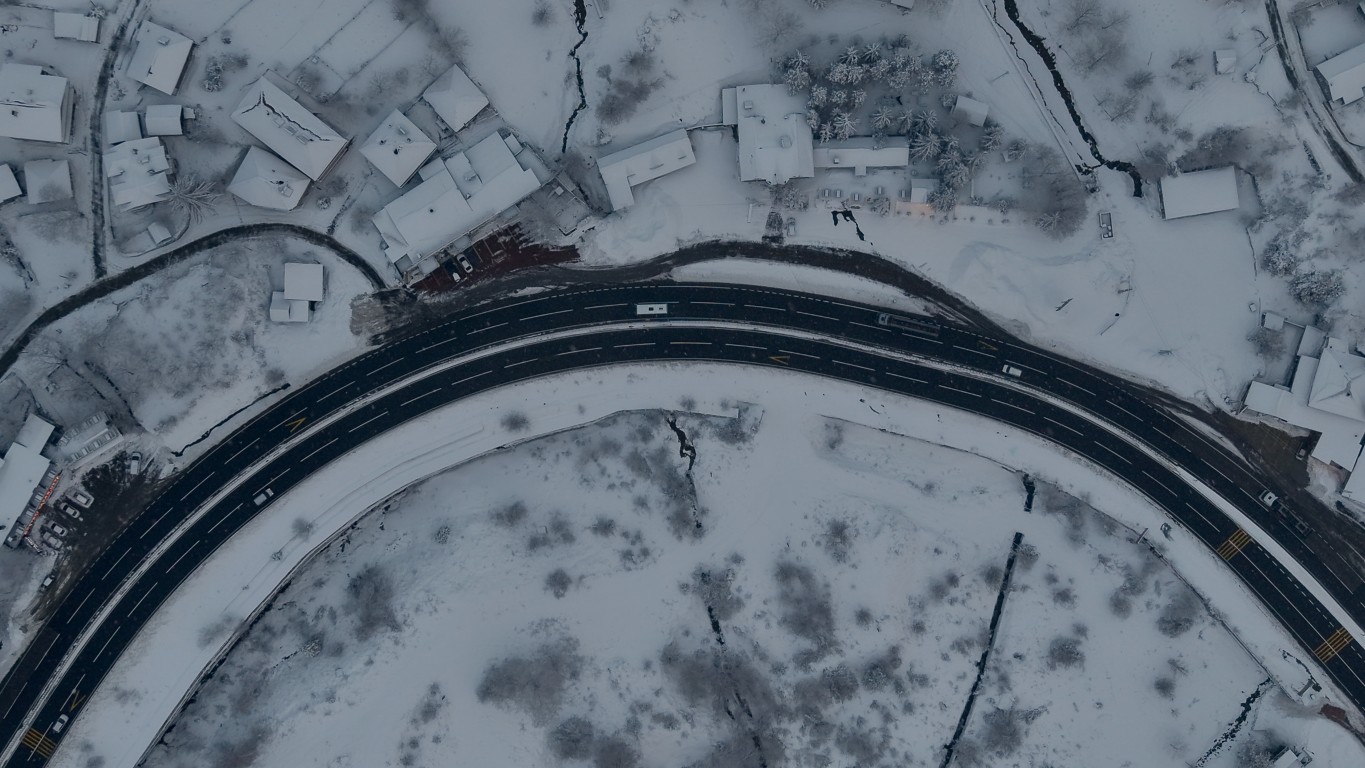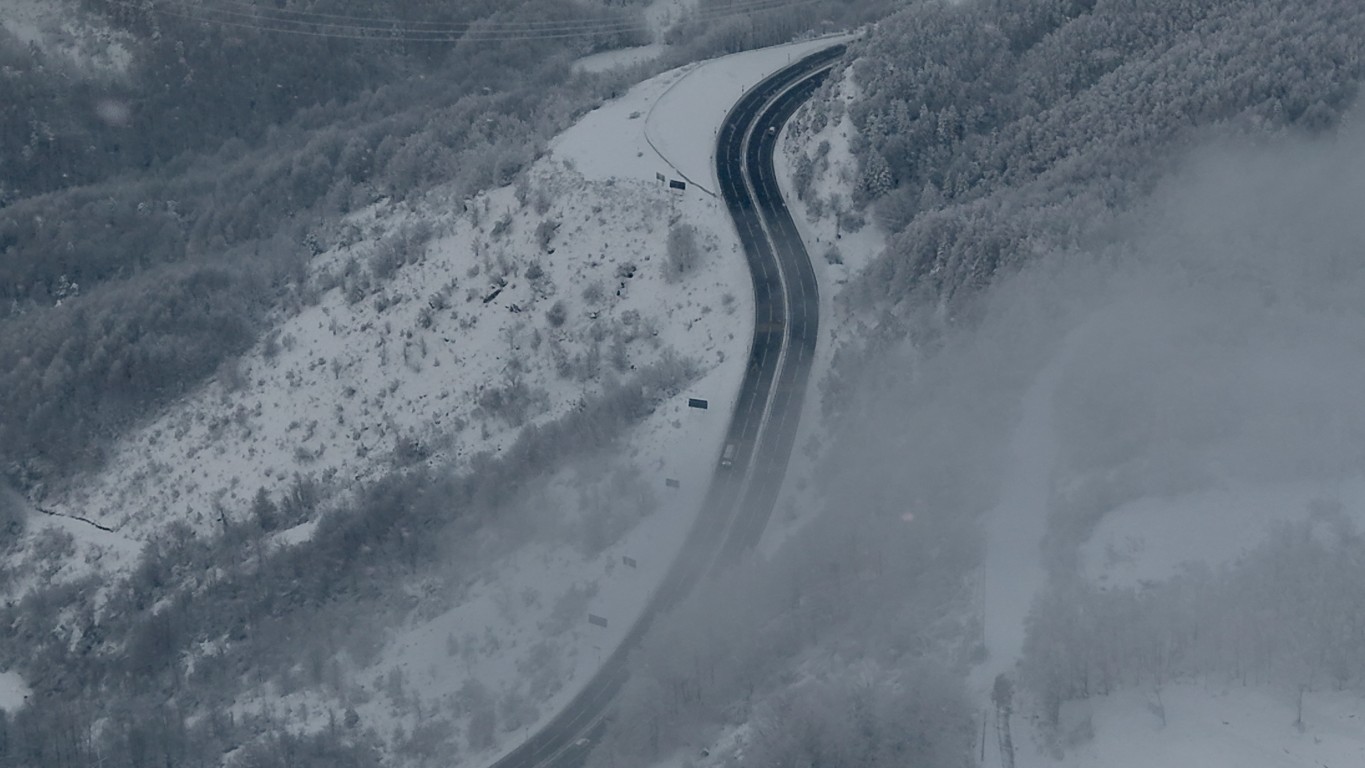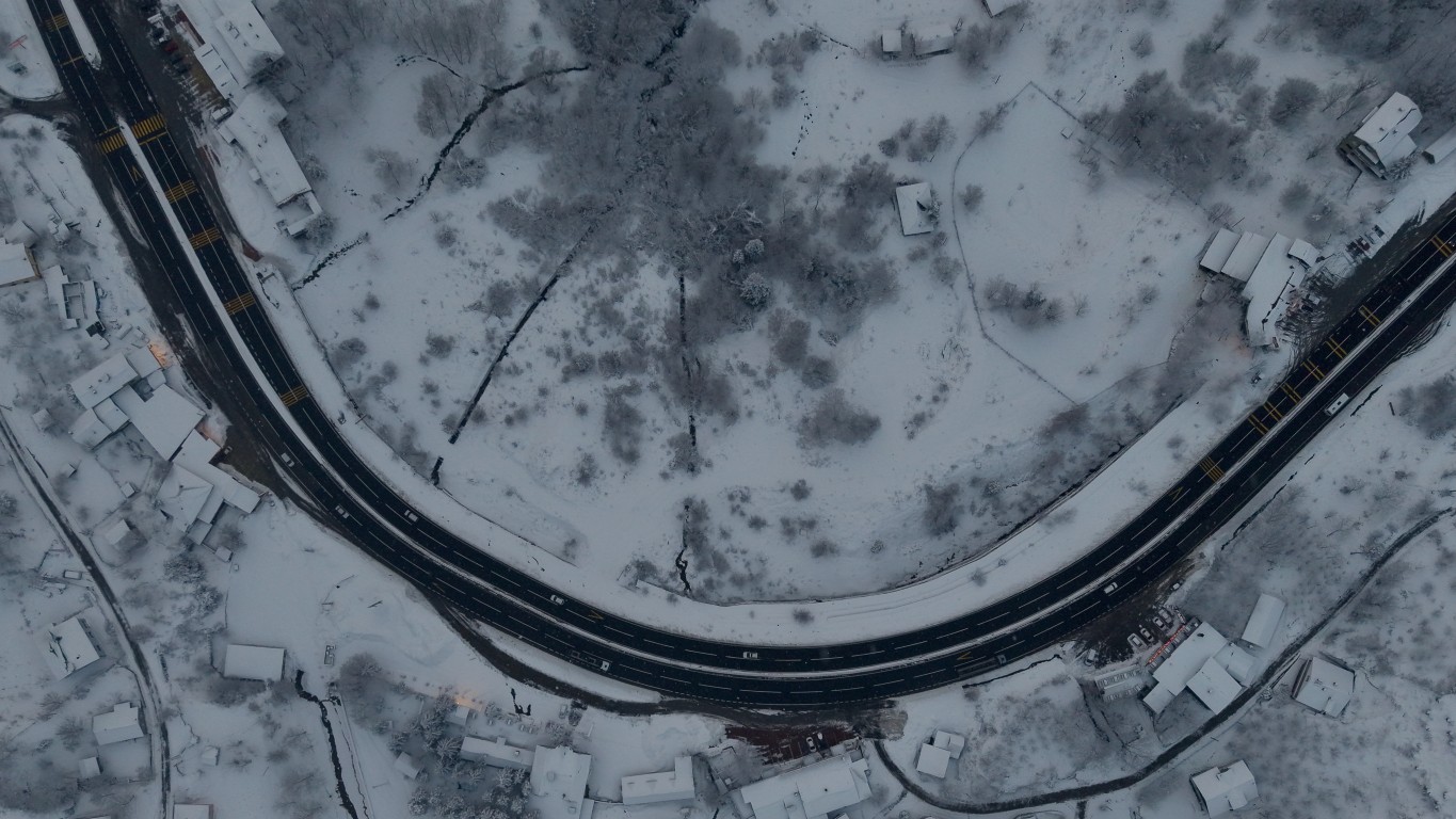 Bölgedeki çam ağaçlarının beyaz örtüyle bütünleşmesi ve iki ana ulaşım aksının aynı karede yer aldığı anlar havadan kayda alındı.