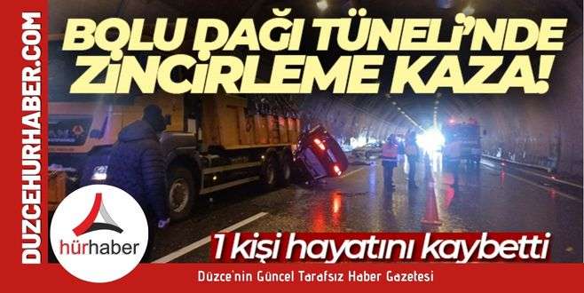 Bolu Dağı Tüneli'nde tır, otomobil, yolcu otobüsü ve kar küreme aracının karıştığı zincirleme kazada, otomobil sürücüsü hayatını kaybetti.Kaza, TEM Otoyolu Bolu Dağı geçişi tünel içinde meydana geldi. Edinilen bilgiye göre, tünel içinde tır, otomobil, yolcu otobüsü ve kar küreme aracı zincirleme kazaya karıştı. İhbarla olay yerine sağlık, trafik ve itfaiye ekipleri sevk edildi. Yapılan incelemelerde otomobil sürücüsünün hayatını kaybettiği tespit edildi. İlk belirlemelere göre, kazada 6 kişinin yaralandığı öğrenildi.Ekiplerin olay yerindeki müdahaleleri sürüyor.