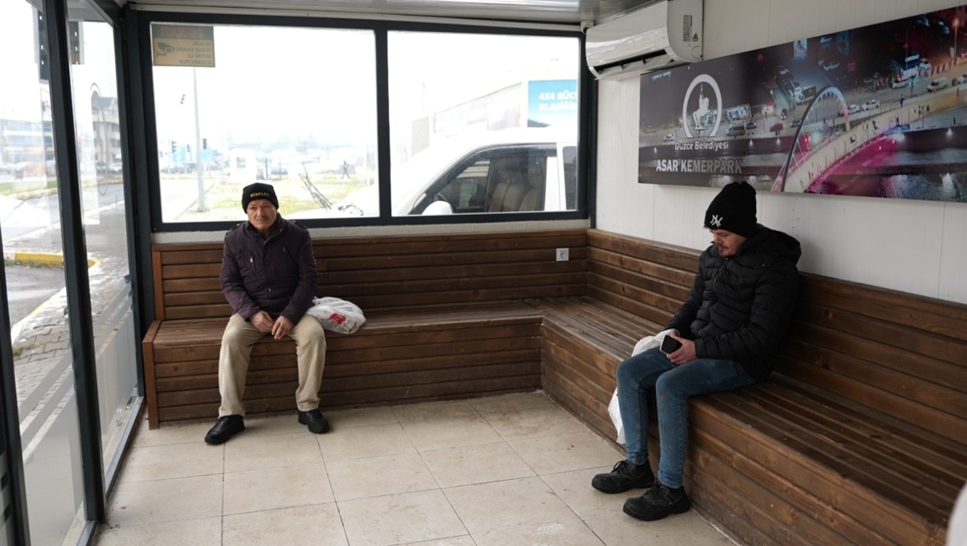 Düzce Belediyesi’nin öz kaynaklarıyla üretilen akıllı duraklar, otobüs bekleyen vatandaşlara kışın sıcak, yazın ise serin ortam sağlıyor.