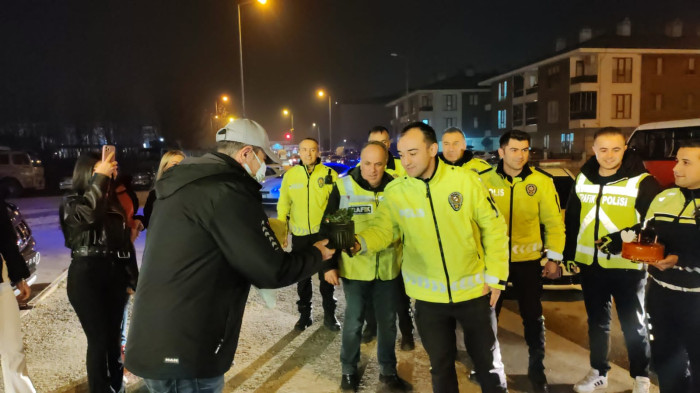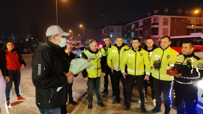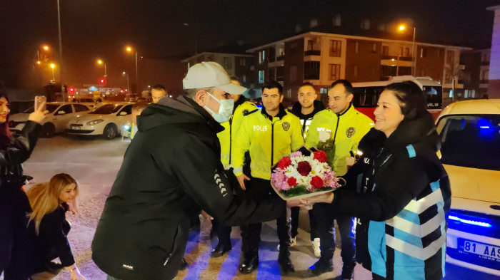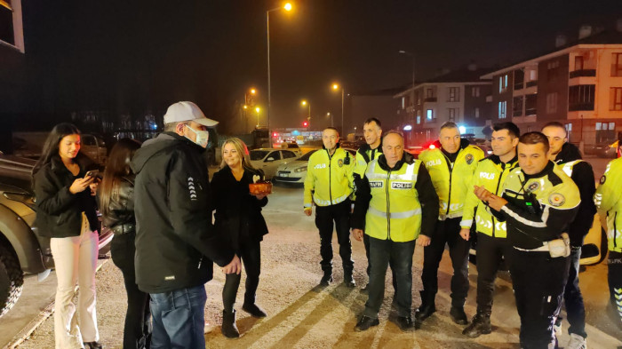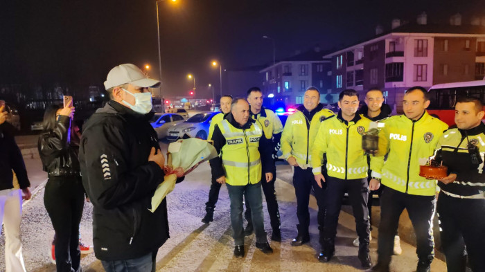 Uzun yıllar Düzce İl Emniyet Müdürlüğü Trafik Tescil ve Denetleme Şube Müdürlüğü’nde görev yapan ve yakalandığı kanser rahatsızlığı için tedavisine başlanan polis memuru için görev yaptığı arkadaşları uygulama noktasında sürpriz doğum günü kutlaması yaptı.