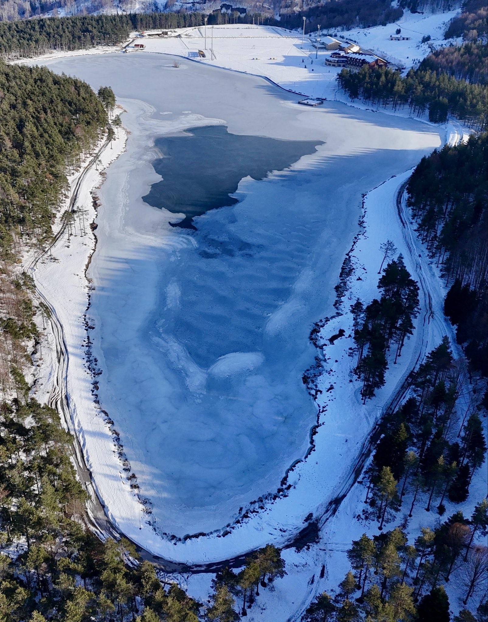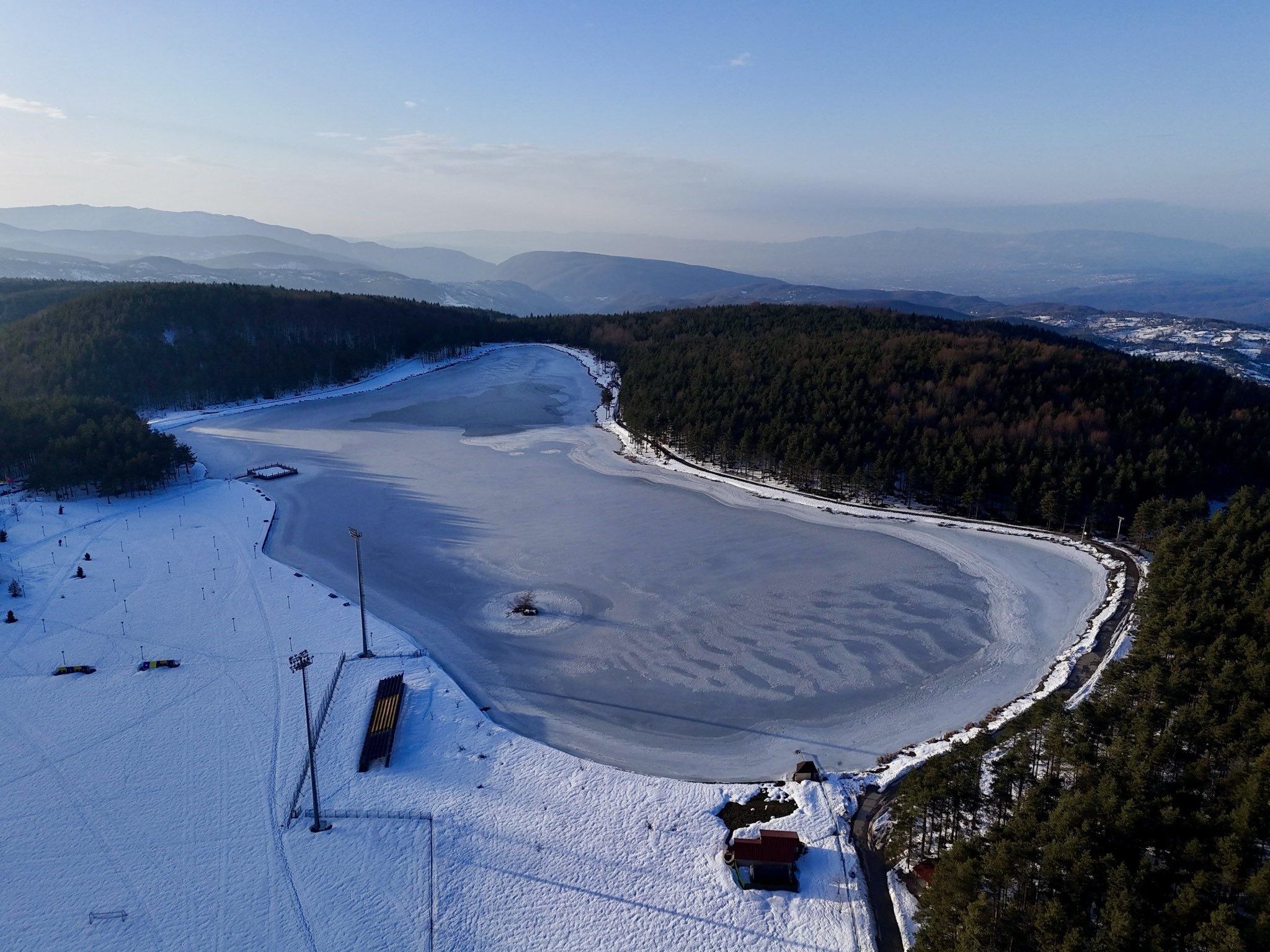 Kar yağışının ardından beyaza bürünen yayla ve donan göletin oluşturduğu manzara, dron ile havadan görüntülendi. Bölgede soğuk havanın etkisini sürdürmesi bekleniyor.