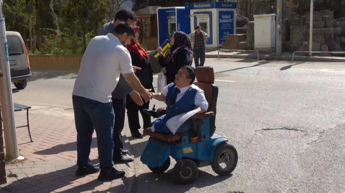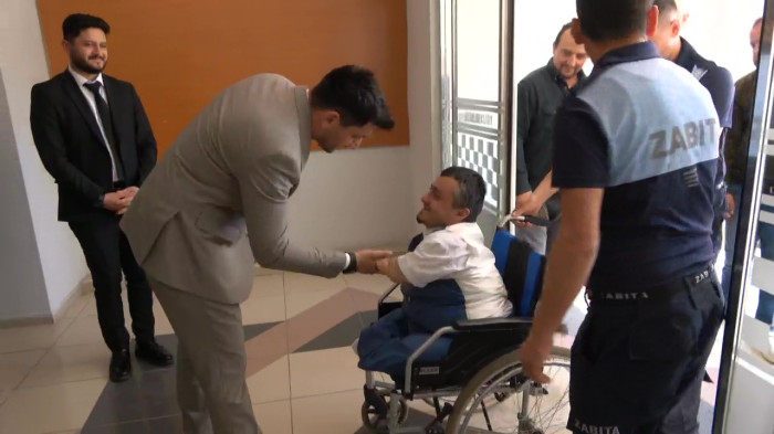 Belediye Başkanlığı binasında ise özel gereksinimle bireyler için asansör ve rampa olmaması nedeniyle merdivenleri çıkamayan Esat Balcıya zabıtalar yardımcı oldu. Esat Balcı’nın tekerlekli sandalyesine omuzlayan zabıtalar kucaklarına alarak Balcıyı Belediye binasına çıkarttı.