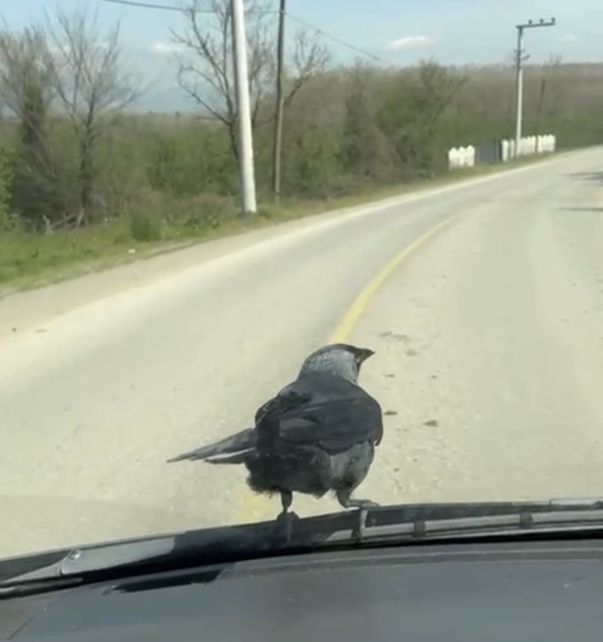 O anlar cep telefonu kamerasıyla kaydedildi.Edinilen bilgilere göre, trafikte seyir halinde olan Hakan Çiçekoğlu’nun kullandığı otomobilin ön cam sileceğine bir karga kondu.