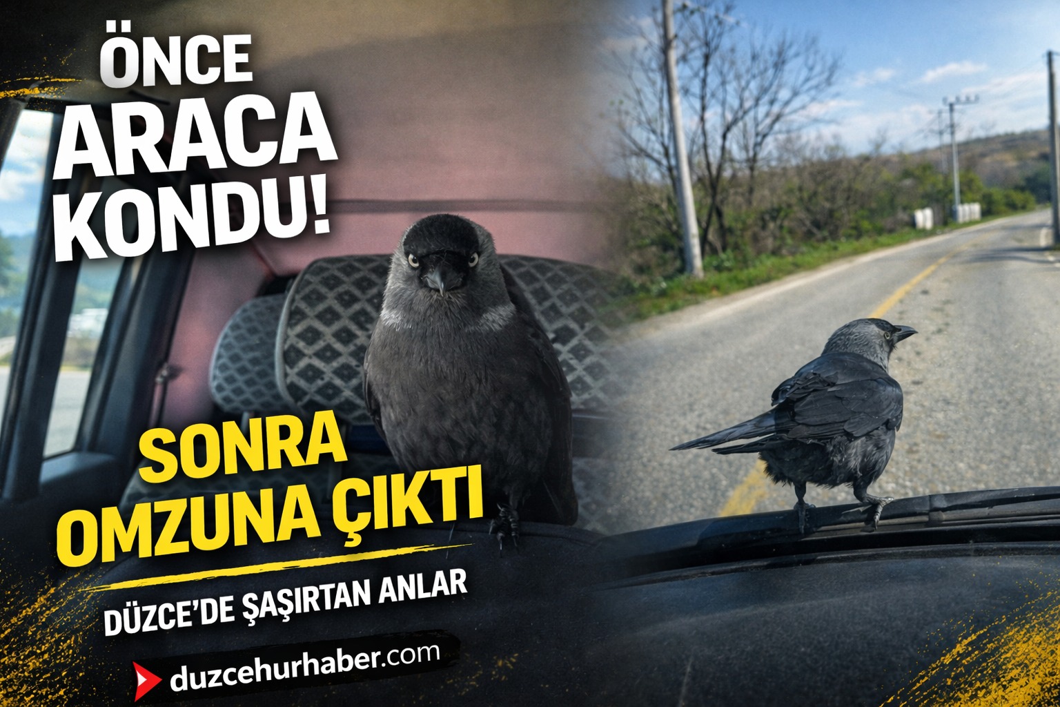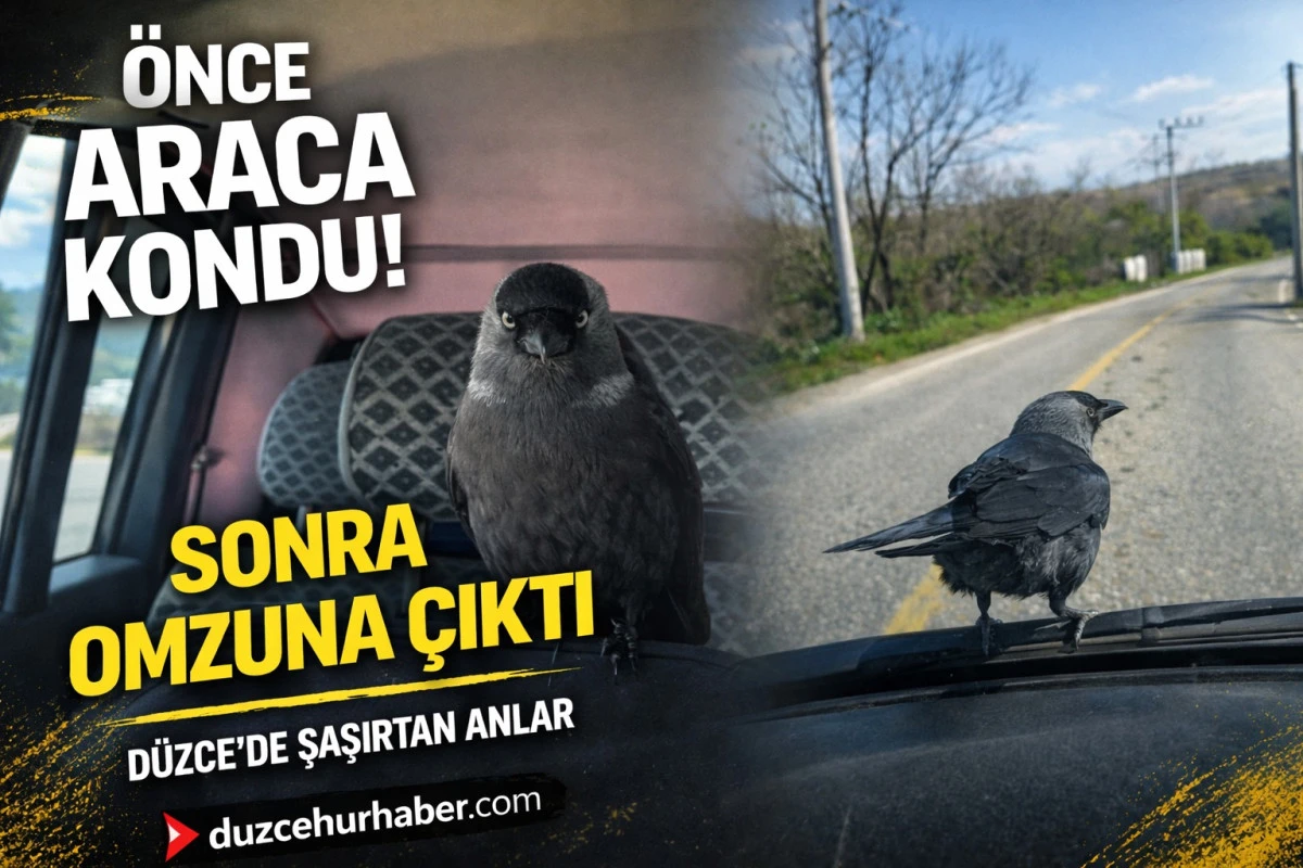 Düzce’de seyir halindeki otomobile konan karga, açık camdan içeri girerek sürücünün omzuna çıktı. O anlar kameraya yansıdı.