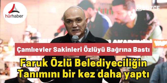 Düzce Belediye Başkanı ve AK Parti Düzce Belediye Başkan Adayı Dr. Faruk Özlü, Çamlıevler Mahallesi sakinleriyle buluşmasında, vatandaşlardan 31 Mart seçimlerinde destek isteyerek, “Belediyecilik, insanın her anına dokunan hizmetler manzumesidir” dedi. Düzce Belediye Başkanı ve AK Parti Düzce Belediye Başkan Adayı Dr. Faruk Özlü, 31 Mart yerel seçimleri çalışmaları kapsamında Bahçeşehir Bölgesi Çamlıevler Mahallesi sakinleriyle çadır toplantısında biraraya geldi.