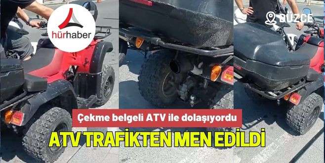 Düzce’de son dönemde yaşanan trafik kazalarına karışan ve trafiği tehlikeye düşürdüğü için sık sık şikayet konusu olan motosikletlere karşı Düzce İl Emniyet Müdürlüğü Trafik Tescil ve Denetleme Şube Müdürlüğü ekipleri denetim ve uygulamalarını artırdı. Bu çerçevede şehrin birçok noktasında uygulama yapan ekipler, çekme belgesi ile trafiğe çıkan ATV adı verilen arazi motorunu durdurdu. Plakası ve ruhsatı olmayan ATV nin sürücüsüne 4 bin 64 TL ceza kesilirken ekipler ATV’yi de trafikten men ederek yediemin otoparkına çektiler.