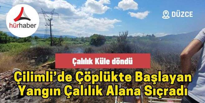Çilimli’de çöplükte başlayan yangın çalılık alana sıçradı. Yangında otluk ve çalılık alan küle döndü.