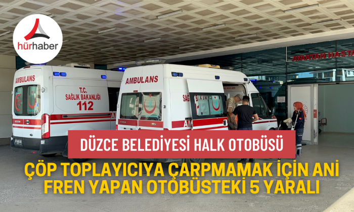 Düzce’de önüne çıkan çöp toplayıcıya çarpmamak için ani fren yapan özel halk otobüsündeki 5 kişi yaralandı.Kaza, Bolu Caddesi üzerinde meydana geldi. Alınan bilgilere göre, Adliye istikametinden şehir merkezi istikametine seyir halinde olan D.F. idaresindeki 81 FR 368 plakalı Düzce Belediyesi Halk Otobüsü, Bolu Caddesi üzerinde aniden önüne çıkan çöp toplayıcısına çarpmamak için fren yaptı. Otobüsün içerisinde yolcu olarak bulunan E.Ş. (20), H.A. (38), B.E.A. (22), P.K. (2) ve S.T. (33) yaralandı. Yaralılar bölgeye gelen ambulanslarla hastaneye kaldırılırken, kaza ile ilgili inceleme başlatıldı.