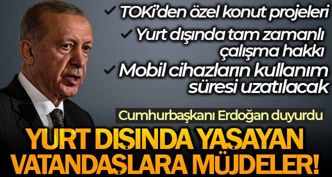 Cumhurbaşkanı Recep Tayyip Erdoğan, yurt dışında yaşayan Türk vatandaşlarına müjdeler verdi. Erdoğan, TOKİ vasıtasıyla özel konut projeleri üreteceklerini, yurt dışı borçlanması yoluyla emekli olanlara yurt dışında tam zamanlı çalışma hakkı tanıyacaklarını belirtti. Erdoğan, mobil cihazların Türkiye’de kayıtsız kullanım sürelerinin 180 güne çıkartılacağını kaydetti.