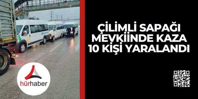 Düzce D100 Karayolu ışıklı kavşakta 4 aracın karıştığı zincirleme trafik kazasında 10 kişi yaralandı.Kaza, sabah saatlerinde D100 yolu Çilimli Sapağı mevkiinde meydana geldi. Edinilen bilgilere göre; Bolu'dan Sakarya istikametine gitmekte olan Adnan S.'nin kullandığı 81 S 1440 plakalı servis minibüsü, aynı istikamete gitmekte olan İsa S. idaresindeki 41 SN 710 plakalı tır ile çarpıştı. İki aracın arkasında seyretmekte olan Yakup A.’nın kullandığı 81 S 1219 plakalı servis minibüsü ile Recep A.’nın kullandığı 81 ABS 264 plakalı servis minibüsleri de birbirlerine çarptı. Kazada servis minibüsünde bulunan işçilerden Züleyha Y., Sevda Ş., Nihal T., Fatma E., Seda B., Büşra M., Emine A., Hanife K., Esra S. ve Özlem B. yaralandı.Kazayı görenlerin ihbarı ile olay yerine gelen sağlık ekipleri tarafından ilk müdahaleleri yapılan yaralılar Atatürk Devlet Hastanesi ve Düzce Üniversitesi Hastanesinde tedavi altına alındı. Yaralı işçilerin sağlık durumunun iyi olduğu öğrenilirken kazayla ilgili inceleme başlatıldı.