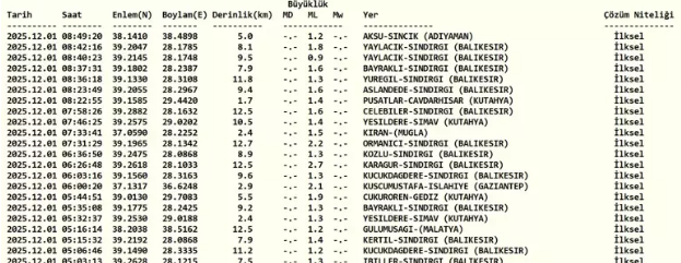 BUGÜN DEPREM Mİ OLDU? 1 ARALIK PAZARTESİ