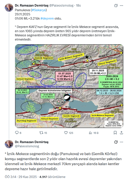 Sakarya'nın Pamukova ilçesinde gece 01.06'da meydana gelen 3,1 büyüklüğünde deprem meydana geldi.Sarsıntı kısa süreli paniğe neden olurken paleosismolog Dr. Ramazan Demirtaş, dikkat çeken paylaşımlarda bulundu.