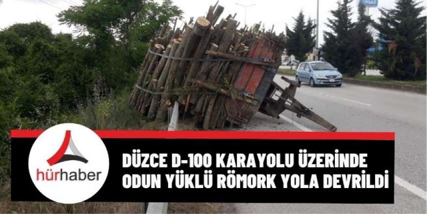 Düzce D-100 Karayolu üzerinde kontrolden çıkan odun yüklü traktör römorku, yol kenarına devrildi. Kazada sürücü ise yara almadan kurtuldu.Kaza Düzce D-100 Karayolu üzerinde meydana geldi. Edinilen bilgilere göre Oktan K. İdaresindeki 14 FS 841 plakalı traktör, Kapıcı sapağı mevkiinde sürücüsünün direksiyon hakimiyetini kaybetmesi sonrasında devrildi. Römorkun devrildiğini fark eden sürücü, traktörü römorktan ayırarak, traktörünü park ettikten sonra durumu Düzce İl Emniyet Müdürlüğü ekiplerine bildirdi. İhbar üzerine olay yerine gelen polis ekipleri trafiği tehlikeye atan römorkun çevresinde önlem aldı. Trafik kaza nedeni ile kısa süreli tek şeritten verilirken, römorkun kaldırılmasının ardından trafik normal seyrine döndü.