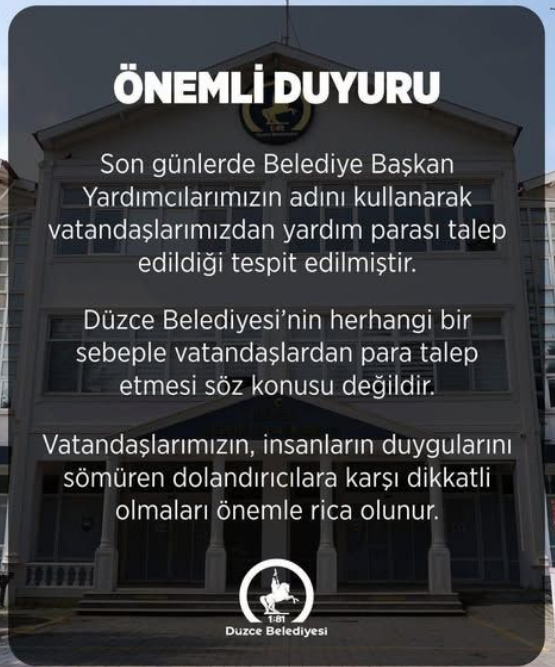 Düzce Belediyesi resmî bir açıklama yaparak, bu tür taleplerin belediye tarafından gerçekleştirilmediğini vurguladı ve vatandaşları bu tür dolandırıcılıklara karşı uyanık olmaları konusunda uyardı.