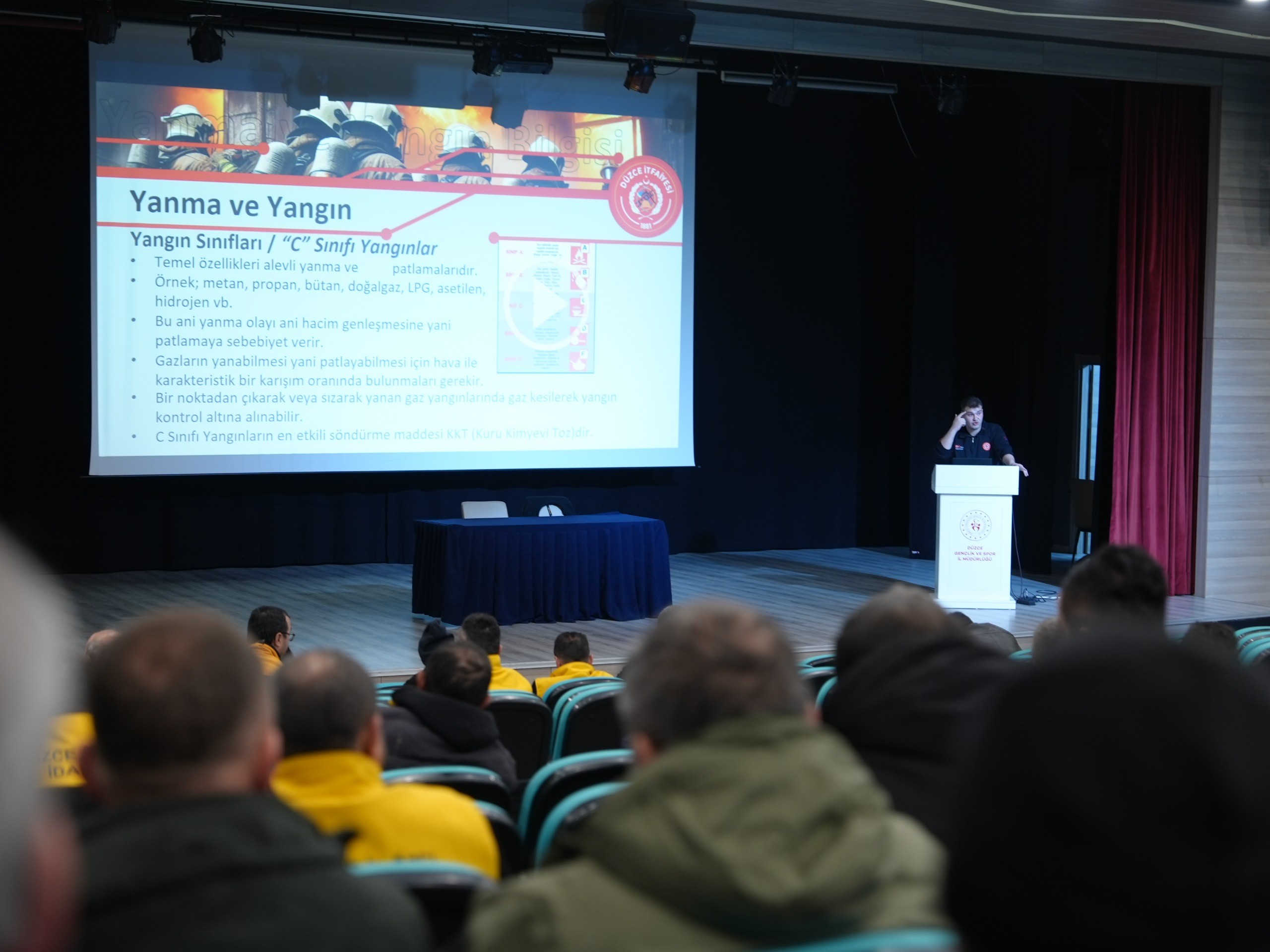 İl Özel İdaresi personellerine, yangın durumuna karşı bilinçlendirmek ve güvenli bir şekilde hareket etmelerini sağlamak amacıyla yapılan eğitimde, yangın durumunda yapılması gerekenlerle ilgili slaytlar eşliğinde teorik bilgi verildi.