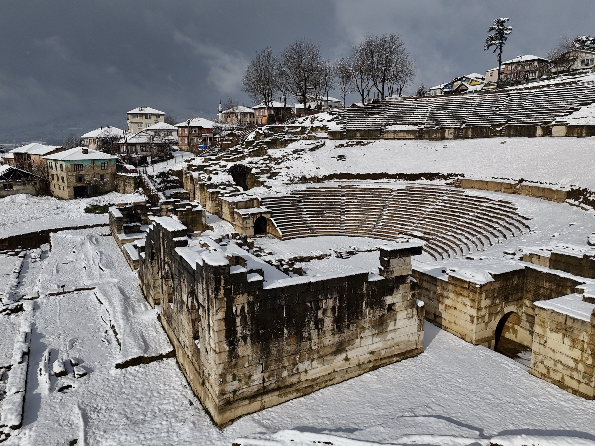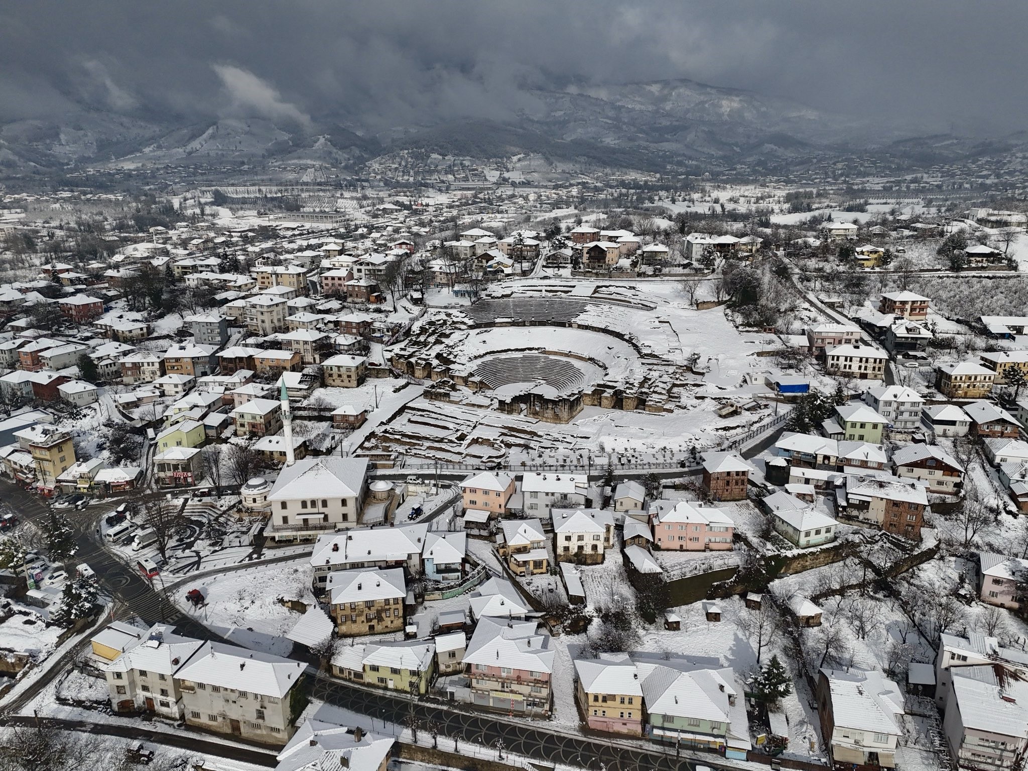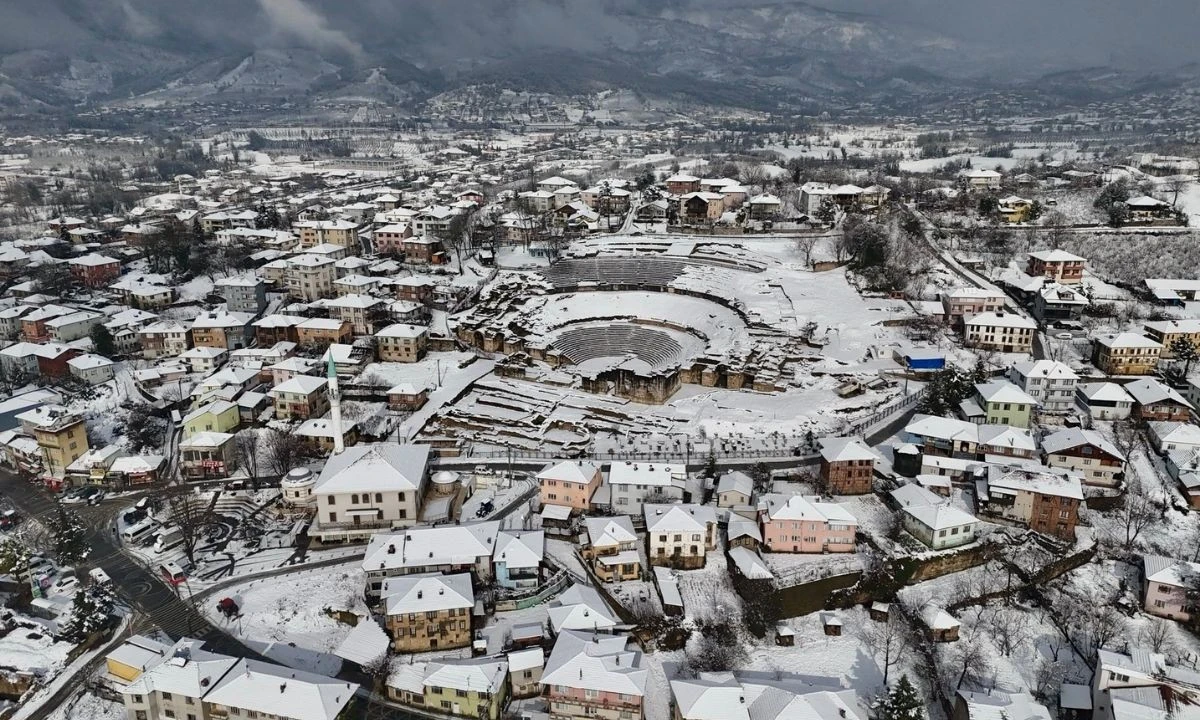Düzce'nin tarihi ve kültürel mirası arasında önemli bir yere sahip olan Prusias Ad Hypium Antik Kenti, etkili olan kar yağışının ardından ortaya çıkan manzarasıyla dikkat çekti.