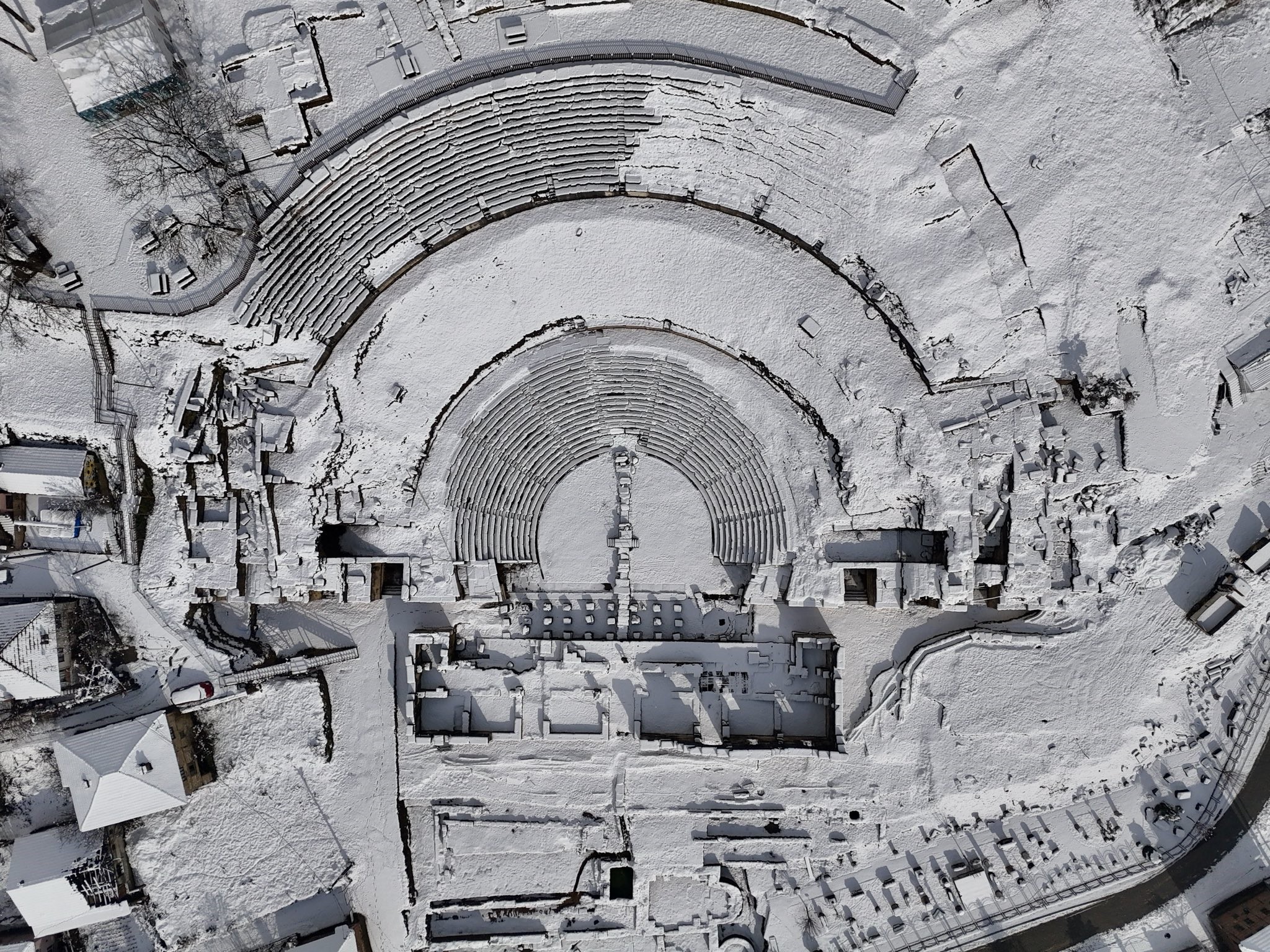 Antik kentin sütunları, tiyatro kalıntıları ve tarihi yapıları karla kaplanırken, beyaz örtü geçmişle bugünü bir araya getiren görsel bir şölen sundu.
