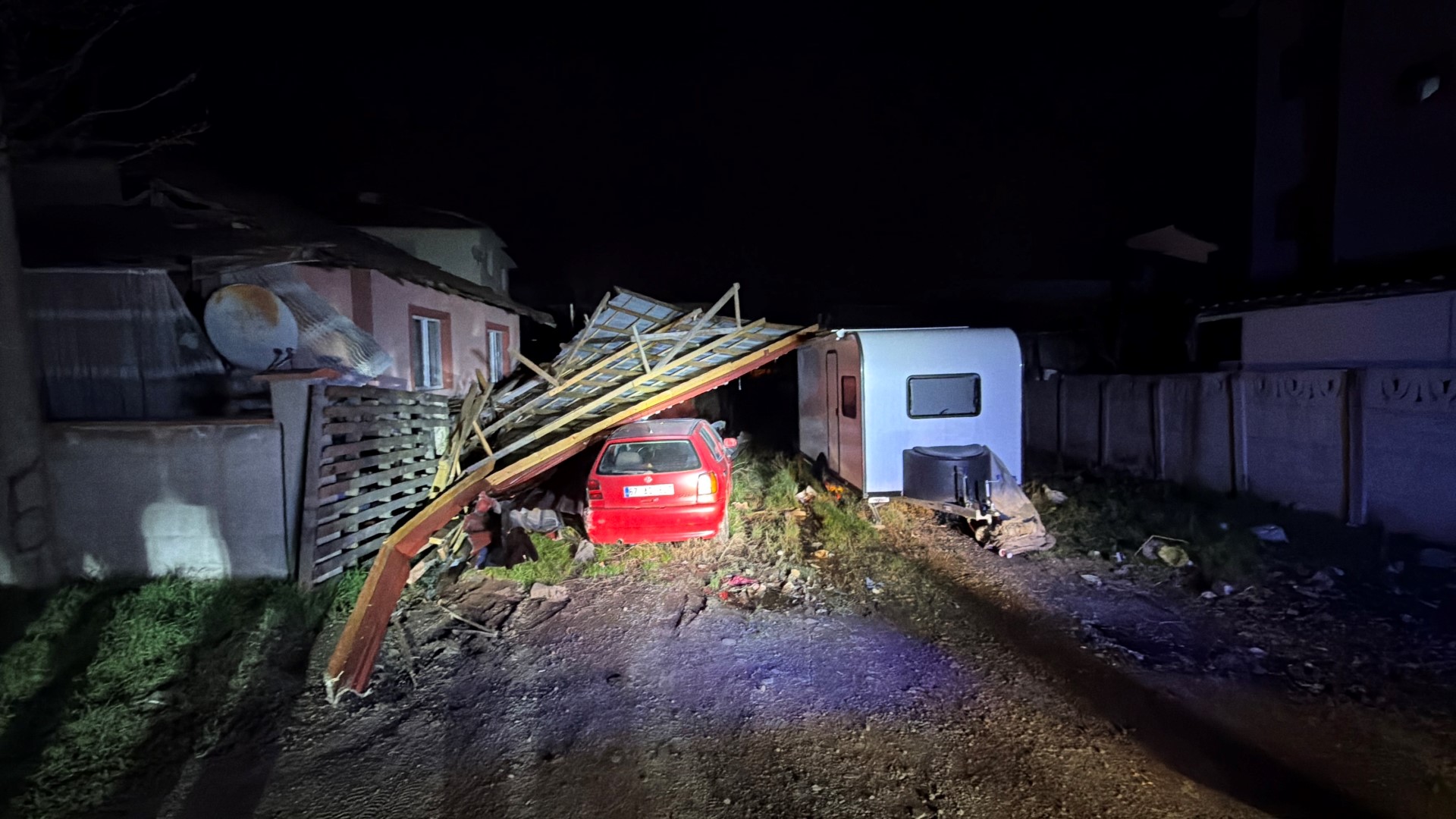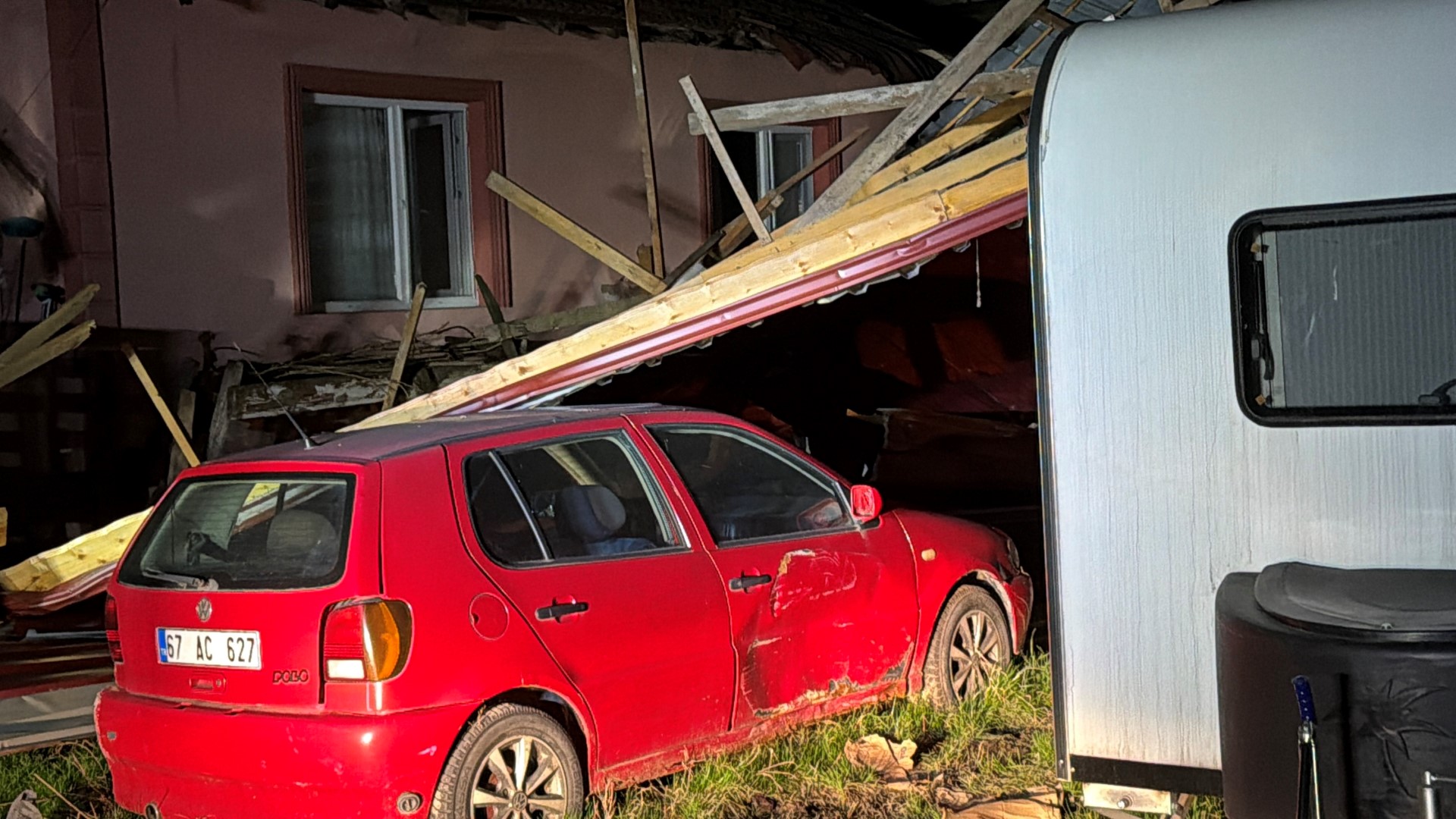 Durum daha da ağırlaşarak, 3 katlı binanın çatısı da kuvvetli rüzgarla sökülüp uçtu ve bir karavana, tek katlı bir eve ve park halindeki bir otomobilin üzerine düştü.