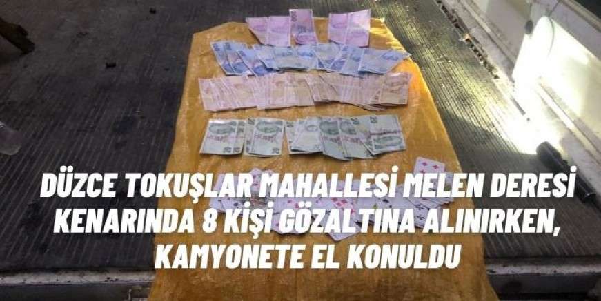 Düzce Tokuşlar Mahallesi Melen deresi kenarında bir kamyonetin kasasına kumar baskını yapıldı. Yapılan baskında 8 kişi gözaltına alınırken, kamyonete el konuldu.