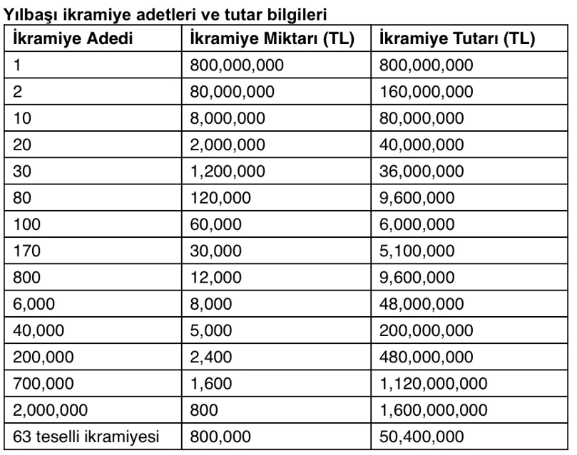 Milli Piyango Yılbaşı Özel Çekilişi'nde 800 milyon TL'lik dev ikramiyenin yanı sıra, toplam dağıtılacak ikramiye miktarı 4 milyar 644 milyon 700 bin TL olarak belirlendi.