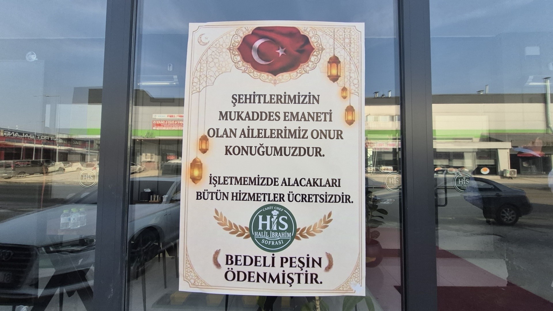 Restoranın girişine asılan “Bedeli peşin ödenmiştir” yazılı afiş, kısa sürede büyük ilgi görürken vatandaşların da takdirini kazandı. Afişte yer alan “Şehitlerimizin mukaddes emaneti olan ailelerimiz onur konuğumuzdur. İşletmemizden alacakları bütün hizmetler ücretsizdir” ifadeleri, duygusal anlara neden oldu.