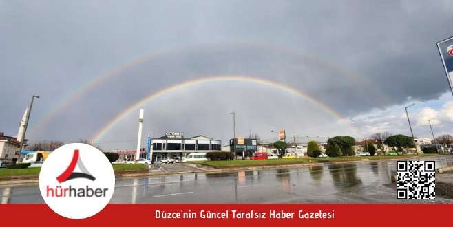 Düzce'de yağmurun ardından oluşan çifte gökkuşağı vatandaşları hayran bıraktı. Meteoroloji Genel Müdürlüğü'nün uyarılarının ardından Düzce'de sağanak etkili oldu. Kent merkezinde etkili olan yağmurun ardından güneş yüzünü gösterdi. Güneşin çıkmasıyla birlikte gökkuşağı oluştu. Gökkuşağı kentin birçok noktasından görüldü.