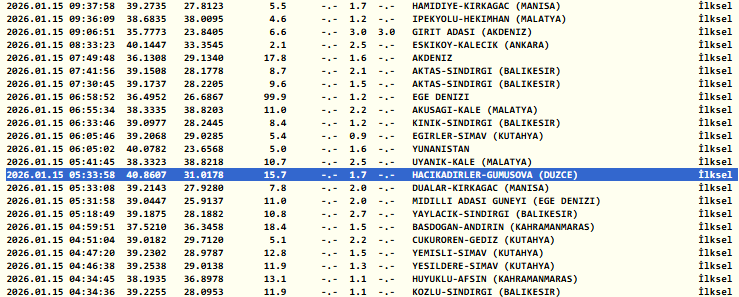 Kandilli Rasathanesi'nin verilerine göre, geceleyin 2,3 şiddetinde bir deprem tespit edildi. Ertesi sabahın ilk saatlerinde ise bölgede 1,7 büyüklüğünde bir sarsıntı daha hissedildi. Deprem uzmanları bu tür küçük çaplı depremlerin bölge için normal olduğunu belirterek, vatandaşlara alışılagelmiş tedbirlerini sürdürmeleri tavsiyesinde bulundu. Bununla birlikte, kısa süre önce Düzce'de meydana gelen 2,8 büyüklüğündeki deprem de dahil olmak üzere, olası artçı sarsıntılara karşı uyanık olma gerekliliği konusunda yetkililer uyarılarını yineledi.