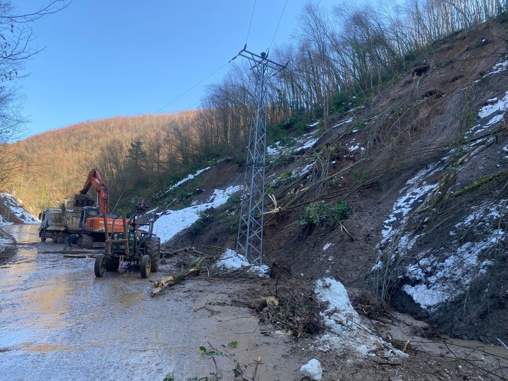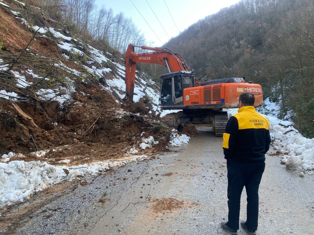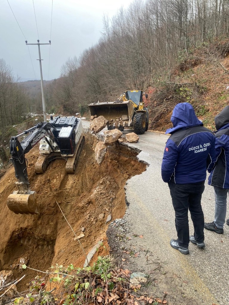 Ulaşımın kapandığı yolun açılması için Düzce İl Özel İdaresi ekipleri çalışmalarını sürdürürken, dün ise aynı noktada bu kez Düzce şehir merkezi ile köye birbirine bağlayan ana yolda toprak kayması nedeniyle kapandı.