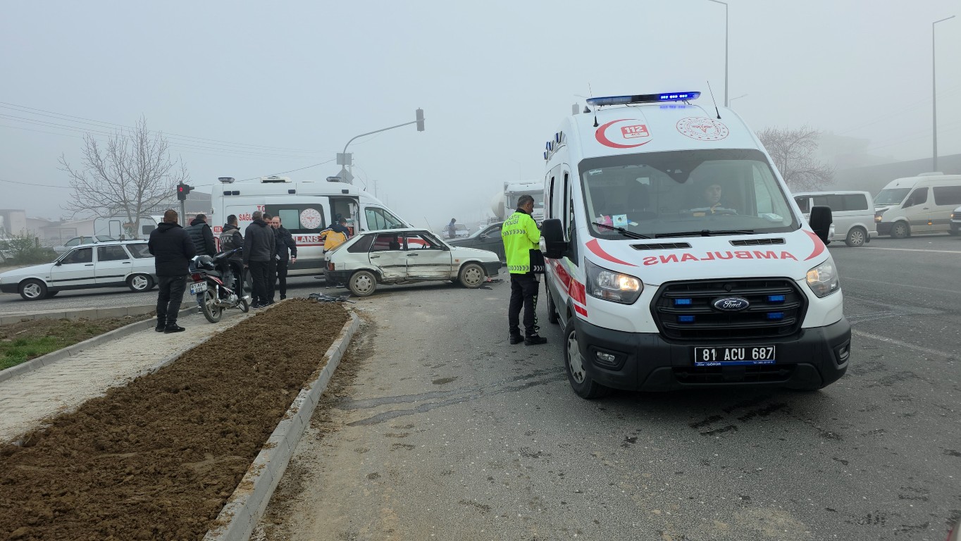 Düzce’de Karaca Kavşağı’nda iki otomobilin çarpıştığı kazada 4 kişi yaralandı. Çarpışmanın etkisiyle araçlardan biri devrildi.
