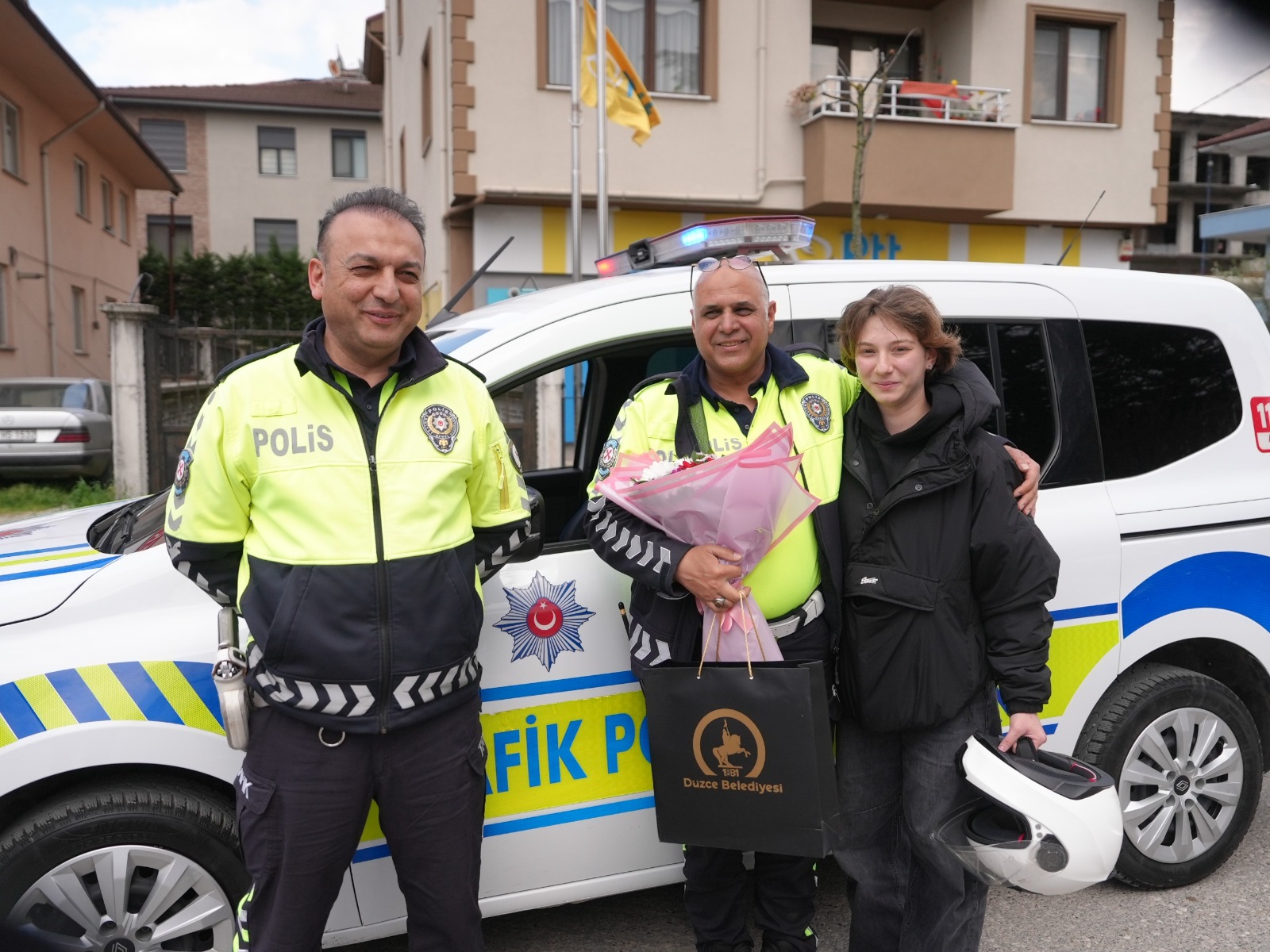Durumu tereddütsüz değerlendiren ekipler, öğrenciyi hızla Düzce Üniversitesi Meslek Yüksekokulu’na ulaştırdı.Görevlerini hassasiyetle yerine getiren polisler, okulda belediye ekiplerinin çiçekli sürpriziyle karşılandı.