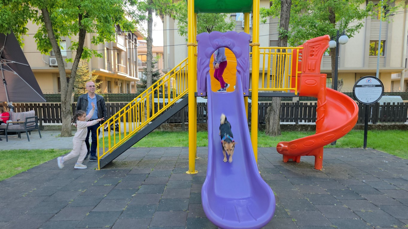 Uzunmustafa Mahallesi’nde sahibiyle birlikte yürüyüşe çıkan Ceku, parkta sergilediği hareketlerle çevredeki vatandaşların ilgisini çekti. Özellikle çocuklarla birlikte kaydıraktan kayması, izleyenlere eğlenceli anlar yaşattı.