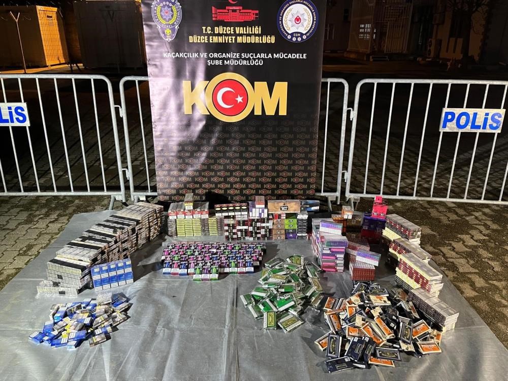 Düzce Cumhuriyet Başsavcılığı koordinesinde, polis ve jandarma ekiplerinin kaçakçılık ve organize suçlarla mücadele kapsamında yürüttüğü çalışmalarda önemli miktarda kaçak ürün ele geçirildi.