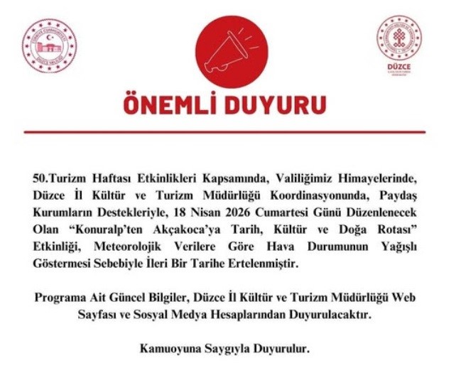 Düzce’de 50. Turizm Haftası etkinlikleri kapsamında gerçekleştirilecek önemli organizasyonlardan biri iptal edildi.Düzce Valiliği himayelerinde, 18 Nisan 2026 Cumartesi günü düzenlenmesi planlanan Konuralp’ten Akçakoca’ya tarih, kültür ve doğa rotası etkinliği, meteorolojik verilere göre hava şartlarının olumsuz olması nedeniyle ertelendi.