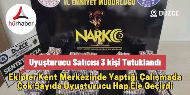 Düzce’de narkotik suçlarla mücadele ekiplerinin Cumhuriyet Başsavcılığı koordinesinde yaptığı çalışmada gençleri zehirleyecek 3 uyuşturucu satıcısı tutuklandı. Şahıslarla birlikte çok sayıda uyuşturucu hap ele geçirildi.Düzce’de uyuşturucu madde satıcılarına ve kullanımına yönelik operasyonlar devam ediyor.