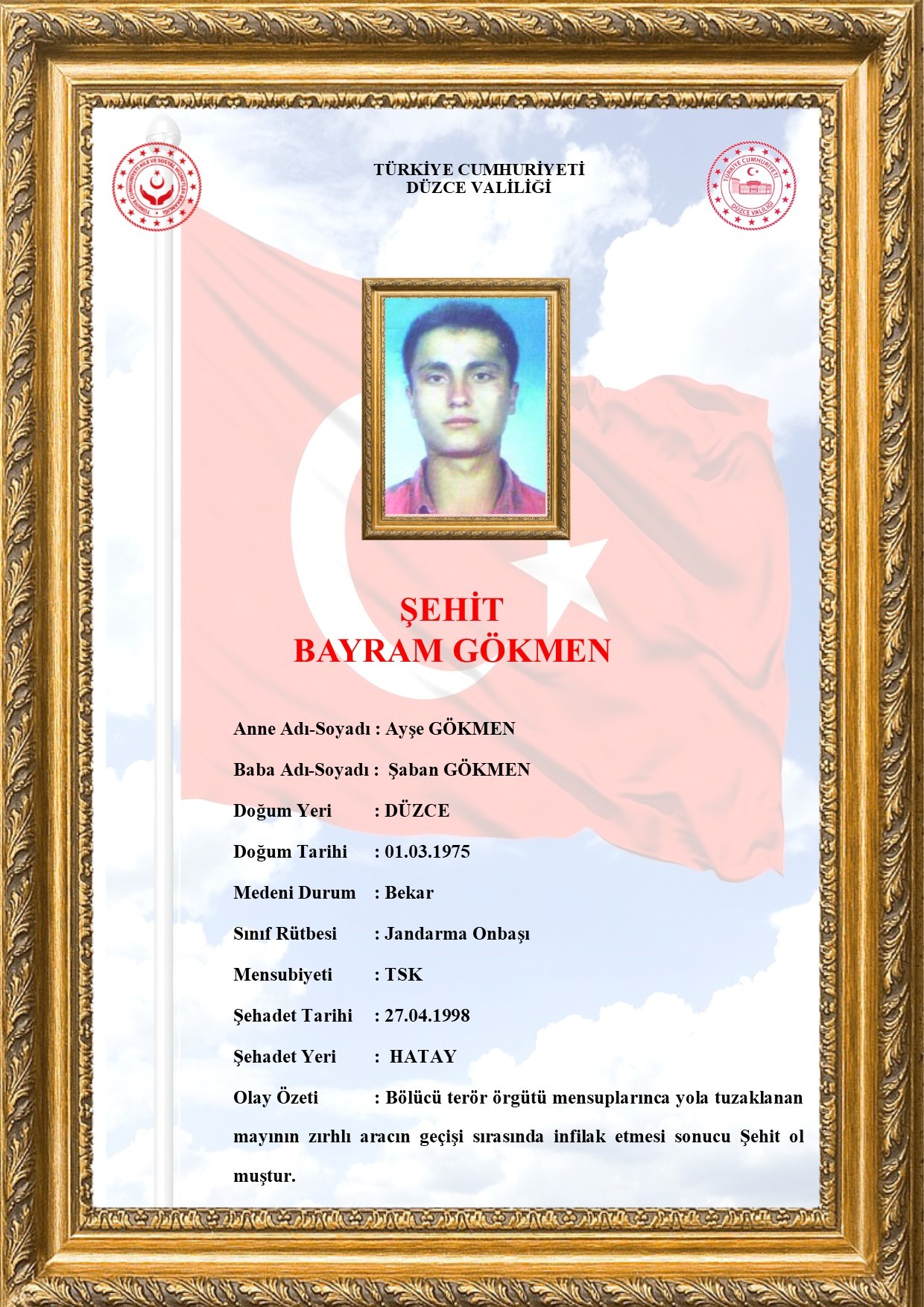 27 Nisan 1998 tarihinde Hatay’da bölücü terör örgütü mensuplarınca tuzaklanan mayının infilak etmesi sonucu şehit olan Bayram Gökmen, yıl dönümünde kabri başında ziyaret edildi.
