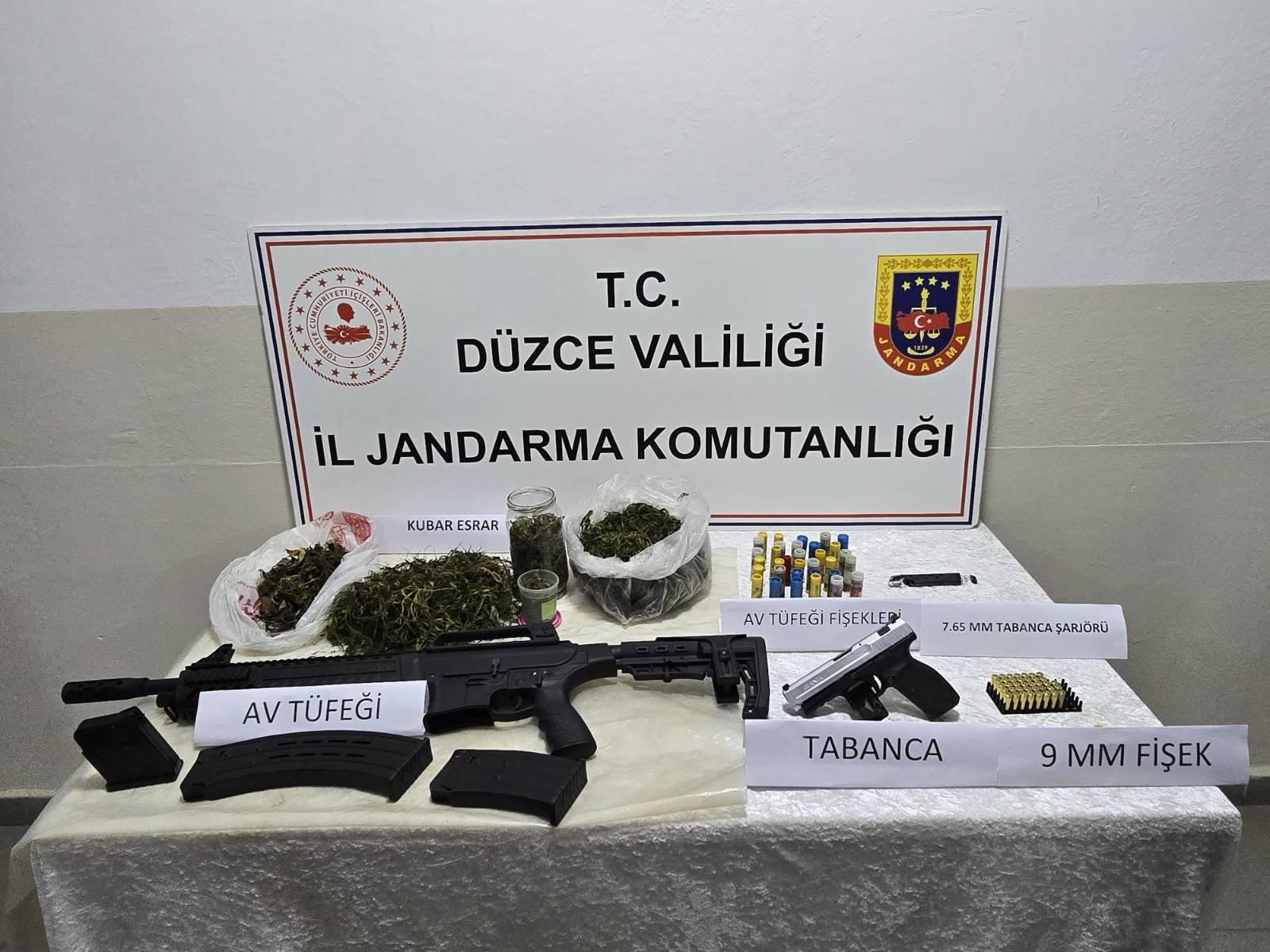 Düzce İl Jandarma Komutanlığı ekiplerinin Gölyaka ilçesinde yaptığı çalışmalarda uyuşturucu ticareti yapan ve ruhsatsız silah bulunduran 1 kişi yakalandı.